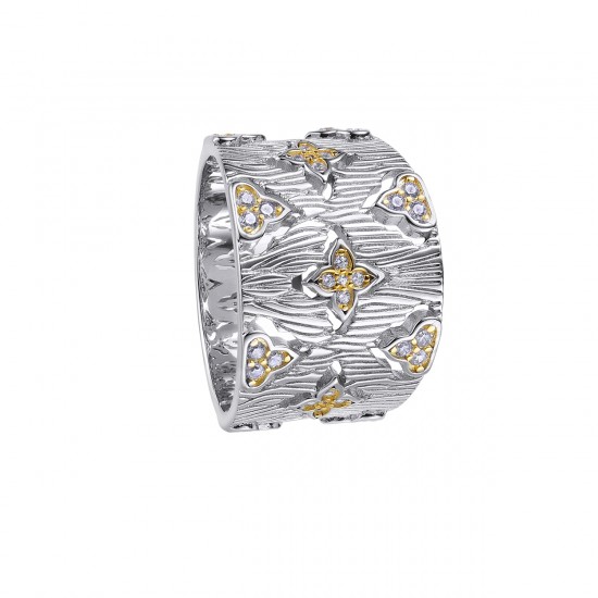 Sortija fabricada en plata de ley con florecitas en plata dorada y una circonita en cada pétalo. Pertenece a la colección L’ etoile de Durán Exquse. Disponible en talla 14. Consúltanos por whatsapp para más tallas y tiempos de entrega.