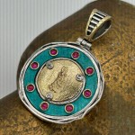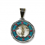 Colgante en plata de ley y centro de broce. detalle en bronce oxidado y rubíes. 36mm de diámetro.
